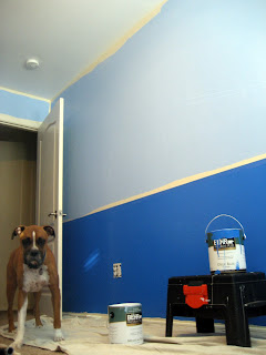 Work on the baby's room has officially started. Paint is on the walls, though it's still a little rough looking. This weekend Mike is going to do all the "hard" work like edging in the paint and such. Also, we are adding a white chair rail to break up the two different blues. The chair rail should be installed this weekend and then furniture will be next.