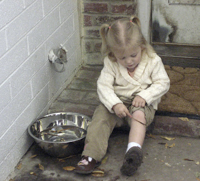 With a house full of grown-ups and so much Thanksgiving prep underway, a little girl has to be creative when it comes to filling her time. Sitting by my back door, I found a stick and the water bowl for the dogs. Put the two together and hours of fun ensue. Okay, maybe not hours, but at least 10 minutes. Here I am, caught in the act!