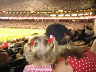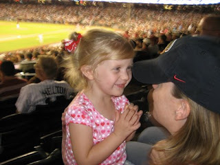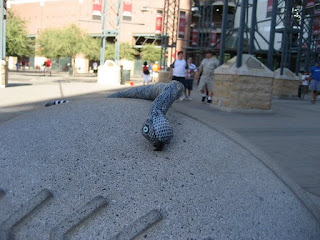 The snake ... at Sunday's game, Shelby really, really wanted one of those silly foam hands ("We're No. 1") and Daddy search all over the stadium for one. But they were all sold out. Instead, Shelb picked out this D'Back. And she got a kick out of making it slither all over Mama and hissing like a snake.