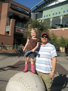 I've mentioned a couple of times we're really trying to embrace our new Arizona home and this can definitely be seen in our enthusiastic support of the Arizona Diamondbacks. Last weekend (Sept. 22-23) we took in not one, but two Diamondbacks' games from Chase field. They were playing the Los Angeles Dodgers (yes, I was torn. I thought about wearing Dodger blue, but forced myself to support my hometown team) and with the playoffs in reach it made for some exciting baseball. Thanks to some recent travels, we got a free hotel room in Phoenix and Shelby was bubbling with excitement about having a slumber party at the hotel. She jumped on the bead. Pressed her little face against the window to check out the pool. And floated in the tub until she looked like a prune!