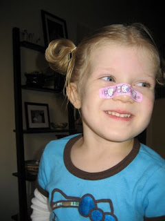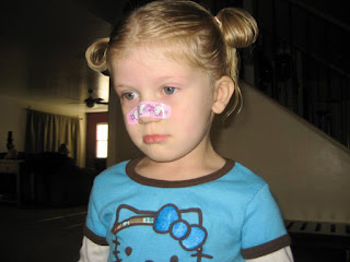 Shelby is such a ham. Get a camera out and she starts to pose. She has been looking so much older the last few weeks, and just so cute ... so I had to get some pictures. She's really into Hello Kitty, so she was modeling one of her cute little Hello Kitty tops. Mike had her stand on our dining room table, because the light in there is better and he wanted her at his level. She willing struck a few poses and then jumped off the table. Yep, jumped off. She's a little bit of a daredevil. On landing, she hit her nose on the floor and started to cry for a Band Aid. She also obsessed with Band Aids right now. Any time she hurts herself, she has to have one. Even if there is no blood, no scratch, no nothing. So, she insisted on having a Hello Kitty Band Aid for her nose.