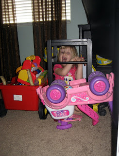 To make the cage, she pulled an assortment of items into my office. Her little car. A wagon. A chair. Her drum set. She was quite thrilled with the end result!