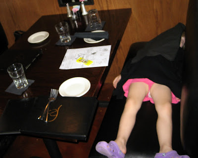 I have another funny picture from Atlanta that I forgot to post. One night we went to dinner at a fancy steak house, but Shelby was exhausted from all the activities an fell asleep on the way there. Below is a picture of her snoozing through the meal. she slept all the way through dinner and didn't even wake up when we picked her up and put her back in the car!