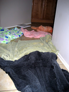 It's gotta be the pregnancy, right? Earlier today I managed to flood our master bathroom. I turned on the water for the big, huge tub and walked away. I had planned on quickly running downstairs, taking care of something and then head back up for a bath. Umm, I must have gotten caught up in doing like 10 things instead of the one thing that originally brought me downstairs and forgot about the filling tub. When I remembered I went racing upstairs, muttering obscenities (yes, I did this. I was mad and upset). I ran through our bedroom to the bathroom to discover that our bathtub had overflowed and water was all over the tile floor. As I made it in, the water was just making its way to the carpet in both the bedroom and the closet. A few minutes more and it would have been a major disaster. Instead, I just had to sop up the water off the tile floors, wring out all the bath maps and then wash all the cleanup supplies. (At left is a picture of the aftermath of my brain fog. I started throwing anything I could reach on the floor to soak up the water. Our robes, towels, etc.)