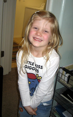 P.S. I took this photo tonight. She's wearing her new favorite shirt. It says Little Miss Giggles on it and that she is. She begged me to wash it tonight, so she can wear it again tomorrow. And to think, she didn't even want to wear it when I suggested it this morning!