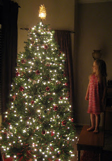 Then, we put up our tree. Shelby has been BEGGING us for days now to put the tree up, so we finally got our act together and set it up. As we put up the tree, Shelby sang Christmas songs, mostly made up ones, which made it that much cuter. She kept telling us how much she loves Christmas and it's her favorite holiday. She was thrilled to have the star on top the tree and the we turned all the lights.