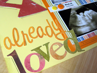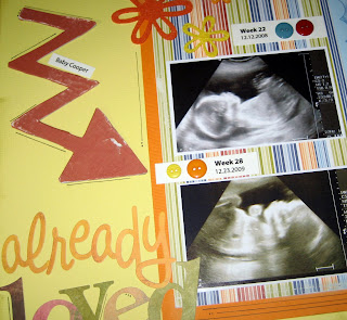 The first page I'd like to show you features some ultrasound photos. With Shelby I started her initial album with the ultrasound photos, so I'm doing the same thing for this baby. Since I'm having a boy this time around, I wanted to stay away from girlie colors and make things a whole lot brighter. The March main kit is the perfect combination of sunshine and pep. Each time I look at it I smile and it makes me think of the circus (not sure why, it just does). So the colors are perfect for a child and a boy baby at that!