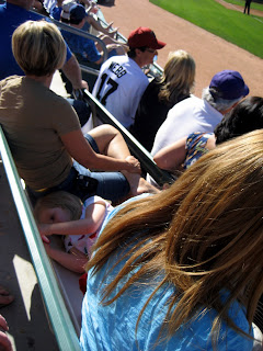 We went to a Spring Training baseball game today. It was our Diamondbacks playing the Cubs. We expected an easy win, but the D'backs sadly fell apart and the Cubs won (hopefully the D'backs will do better during the regular season). But that didn't matter so much for us, we were just happy to be outside enjoying the Tucson sun, the great weather and some baseball. Shelby wasn't as thrilled about the heat, she kept saying she was "soooo hot." For the last two innings she took my iPhone, sprawled out on the bench and played games. She was happy to have Nana block some of the sun for her! We had great seats and we'll be going back again when the Dodgers come to town!