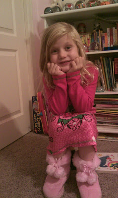 We just cleaned out Shelby's closet, since Savannah will be here for Thanksgiving and it's time to toss out grown clothes to her. Once we found all the too-small shirts, flood pants, and incredibly small hoodies .. .we set out to sort through a bag from Auntie Jennie filled with clothes in Shelby's current size. This particular bag also contained about 8 pairs of almost new shoes ... all fit, all are now being loved by Shelby and she's taken a particular liking to the fuzzy pink boots.