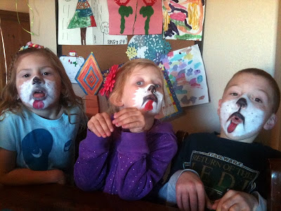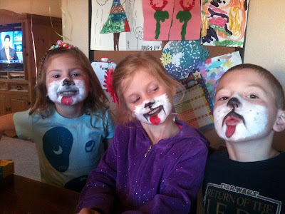 Savannah had a doggy-themed birthday party and the kids got their faces painted as part of the fun. Griffin wouldn't take a picture with Savannah, Shelby and Trevor ... 'cause Shelby and Savannah were giving him a hard time (constant teasing from those two!). But, as you can see .. .the other three cousins where hamming it up and have a great time.