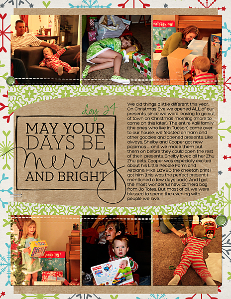 We did things a little different this year. On Christmas Eve we opened ALL of our presents, since we were leaving to go out of town on Christmas morning (more to come on this later!). The entire Kalil family (the ones who live in Tucson) came over to our house, we feasted on ham and other goodies and opened presents. Like always, Shelby and Cooper got new pajamas ... and we made them put them on before they could open the rest of their presents. Shelby loved all her Zhu Zhu pets. Cooper was especially excited about his Little People Farm and Airplane. Mike LOVED the cheetah print I got him (this was the perfect present I mentioned a few days back). And I got the most wonderful new camera bag from Jo Totes. But most of all, we were blessed to spend the evening with people we love.
