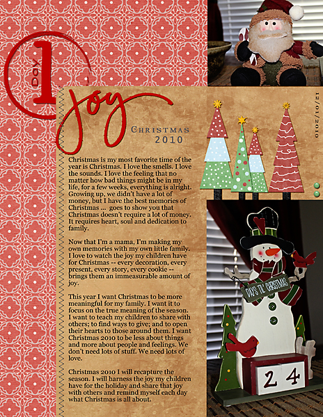 Like a lot of scrappers out there I'm doing a version of December Daily ... where you scrap/chronicle your month and how it relates to the season. I won a seat in Shimelle's "Journal your Christmas" class, so I'm using that for my prompts. I like this class 'cause it's more about the writing and if you have pictures to add ... then great.