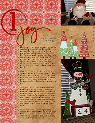 Above is the layout for Day 1 (December 1, 2010). I am doing my album 8 1/2 x 11, which is a different for me. I'm very much a 12 x 12 scrapper. But I thought this particular topic lends itself better to the smaller size.