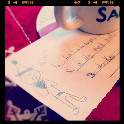 I found this letter to Santa tucked under "his" mug. Written by Shelby without any prompting or help.